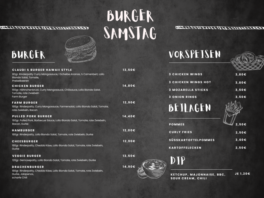 „Jeden Samstag ist Burger-Tag bei uns! Genieße saftige vegetarische Burger mit einer Vielzahl von köstlichen Belägen und hausgemachten Saucen. Kreiere deinen eigenen perfekten Burger oder wähle aus unseren beliebten Kreationen. Ein Geschmackserlebnis, das du nicht verpassen solltest – komm vorbei und teste den Burger-Samstag!“