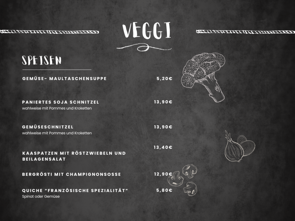 „Entdecke unsere köstliche Auswahl an vegetarischen Gerichten! Von unserer herzhaften Gemüse-Maultaschensuppe über knusprig paniertes Soja-Schnitzel bis hin zu hausgemachten Gemüse-Schnitzeln. Probiere auch unsere Kaasspatzen mit Röstzwiebeln und Beilagensalat, traditionellen Berg-Rösti und aromatische Quiche. Ein Fest für vegetarische Genießer!“